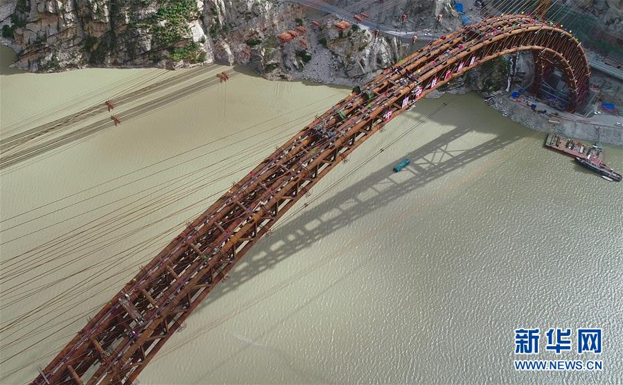 9月28日拍攝的川藏鐵路拉林段重點標志性工程藏木特大橋。 當日,隨著最后一節(jié)鋼管拱的對位和鎖定完畢,川藏鐵路拉林段藏木特大橋成功合龍,標志著大橋主體結構施工取得了關鍵性勝利。藏木特大橋由中國中鐵廣州局集團承建,拱高112米,橋橫跨雅魯藏布江峽谷,水深66米。 新華社記者普布扎西攝