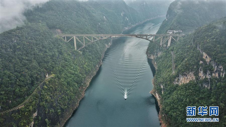 10月18日無人機航拍的江界河大橋。 當(dāng)日,位于貴州甕安縣的江界河大橋云霧環(huán)繞,景美如畫。 新華社記者歐東衢攝