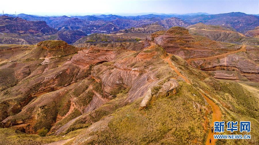 在黃土高原的陜西省延安市安塞區(qū)坪橋鎮(zhèn)王家灣,有一處峽谷丹霞地貌,是2017年陜西省地質調查院在陜北及渭北地區(qū)發(fā)現大規(guī)模丹霞地貌的一部分。這里的山勢頂部被黃土覆蓋,底部經流水下切侵蝕紅色砂巖外露,出露的巖石紋理如波浪,深秋中猶如一幅流動的畫卷。