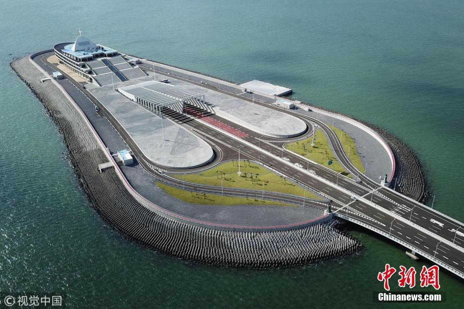 圖為2018年9月18日,強(qiáng)臺(tái)風(fēng)“山竹”吹襲香港過后,港珠澳大橋安然無恙。圖為位于香港海域的港珠澳大橋東人工島。李志華 攝 圖片來源:視覺中國(guó)