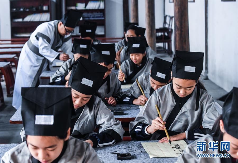 10月23日,學生們在參加“誠敬日”傳統(tǒng)書法學習。當日,浙江省長興縣第八小學舉行“誦家規(guī)家訓,傳中華美德”校園“誠敬日”主題教育活動,通過誦讀國學經(jīng)典、講勵志故事、演美德戲劇等形式,讓學生感受優(yōu)秀傳統(tǒng)文化。近年來,該學校立足“誠敬”文化,注重國學啟蒙教育,讓學生從小培養(yǎng)“以誠立身、以敬處事”的良好品質(zhì)。新華社記者 徐昱 攝
