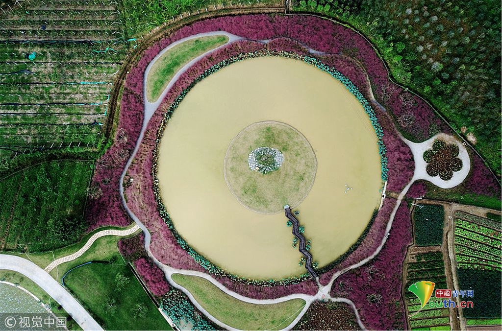 由于這些粉色亂子草圍繞一個(gè)圓形的池塘種植,從空中俯瞰則是另外一番景象,湖心島、池塘,粉黛、草坪與周邊的綠色植物形成了一個(gè)特別的唯美圖案。