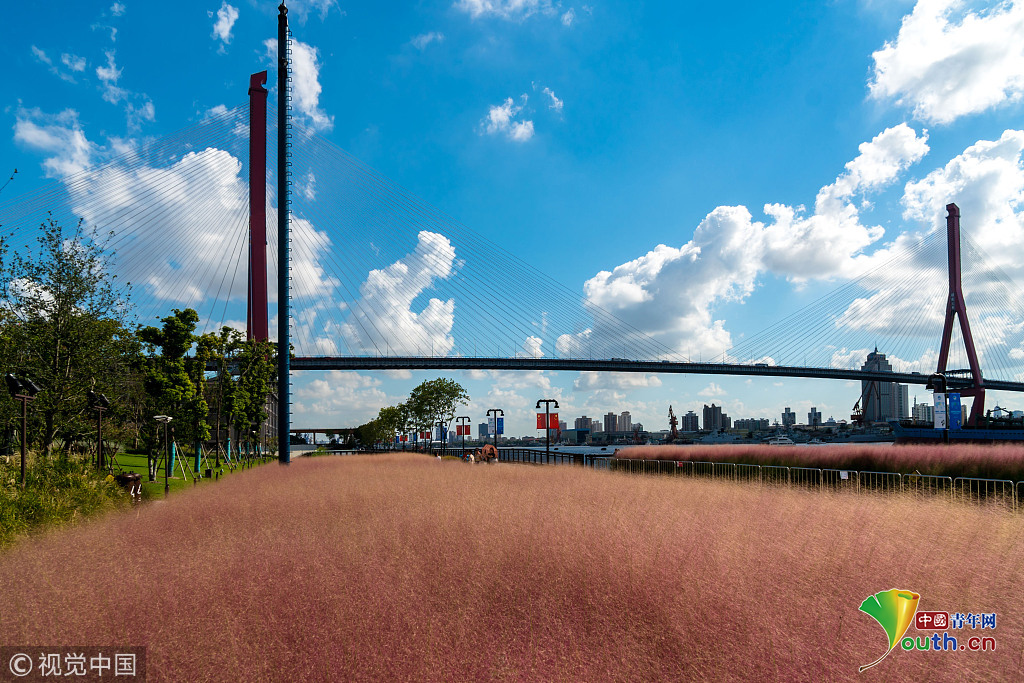 2018年9月28日,上海,東外灘楊浦濱江的粉黛亂子草目前已進(jìn)入盛花期,當(dāng)日早間,不少市民來(lái)到濱江拍照賞景,成片的紫色花海在藍(lán)天白云映襯下美不勝收。圖片作者:王岡/視覺(jué)中國(guó)