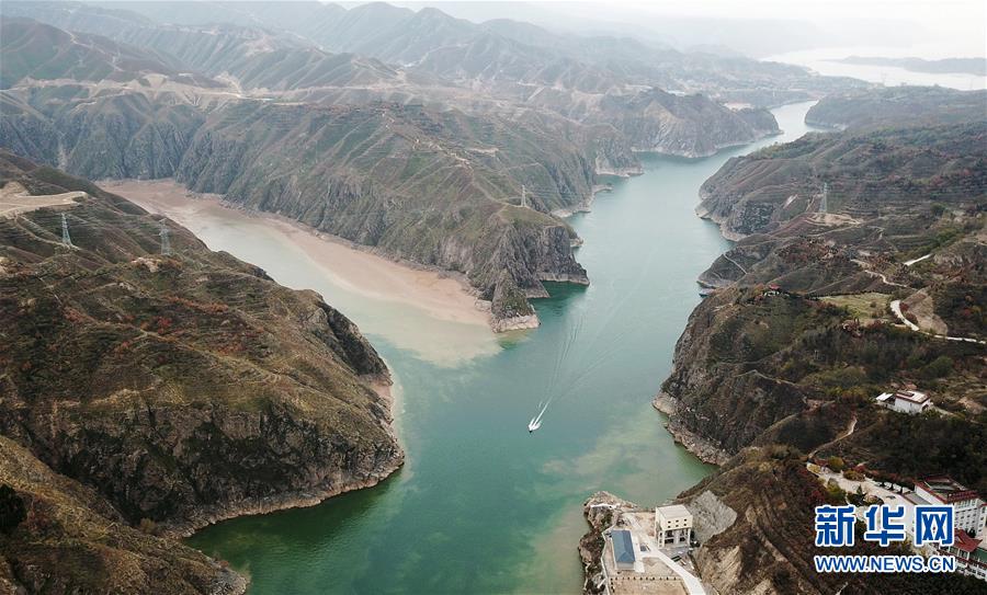 10月24日,一艘快艇從劉家峽水庫(kù)庫(kù)區(qū)的洮河與黃河交匯處駛過(無人機(jī)拍攝)。 新華社記者 陳斌 攝