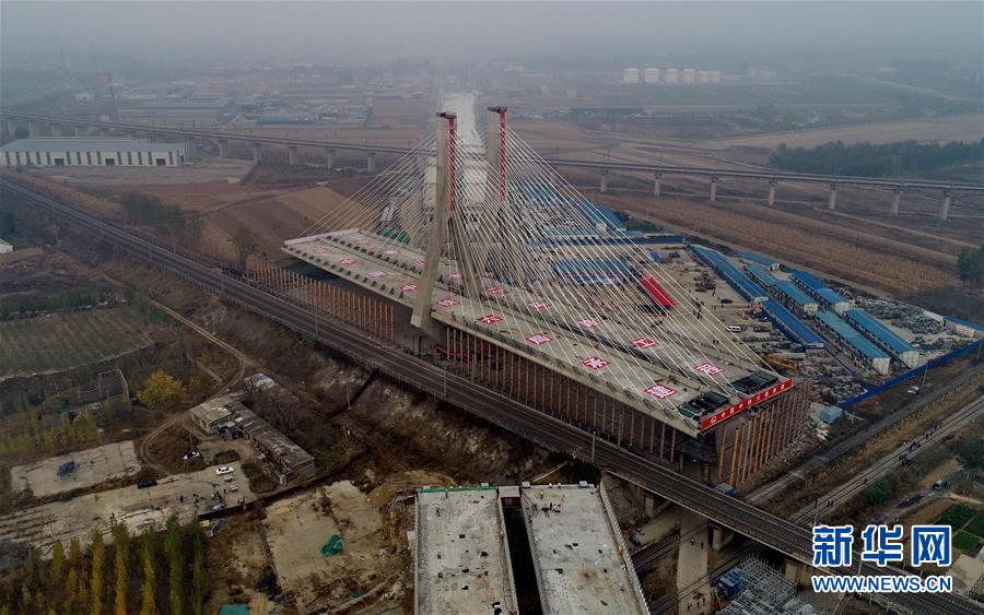 10月25日,唐山市二環(huán)路項(xiàng)目上跨津山鐵路斜拉橋在轉(zhuǎn)體中(無人機(jī)拍攝)。 當(dāng)日,河北省唐山市二環(huán)路項(xiàng)目上跨津山鐵路斜拉橋轉(zhuǎn)體成功。據(jù)介紹,該橋總長927.5米,主橋由斜拉轉(zhuǎn)體橋和轉(zhuǎn)體T構(gòu)橋組成,轉(zhuǎn)體總重5.1萬噸,其中斜拉轉(zhuǎn)體橋重3.3萬噸,主塔高達(dá)80.5米,為曲線變截面“雙人字”形空心塔,自上而下共有128根斜拉索。 新華社記者楊世堯攝