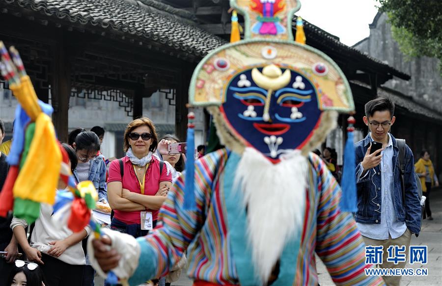 在浙江烏鎮(zhèn)西柵景區(qū)的安渡坊碼頭廣場上,觀眾觀看西藏迥巴藏戲隊出場(10月26日攝)。