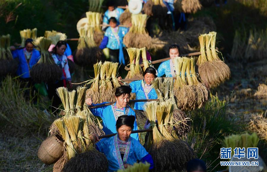 10月30日,在廣西融水苗族自治縣安太鄉(xiāng)元寶村,村民挑著香糯走在田間。 新華社記者 黃孝邦 攝