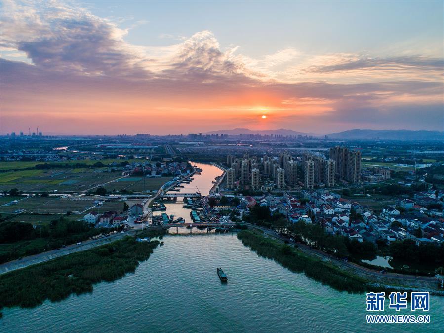這是2018年9月27日航拍的夕陽(yáng)下的新塘村。浙江省長(zhǎng)興縣新塘村毗鄰太湖,該村以蔬菜種植、水產(chǎn)捕撈為主導(dǎo)產(chǎn)業(yè),素有“浙北水產(chǎn)第一村”之稱(chēng)。新華社記者 徐昱 攝