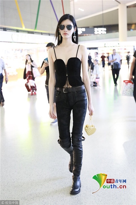2018年7月25日,上海,奚夢瑤現(xiàn)身機場,她穿吊帶馬甲配過膝長靴,頻撩發(fā)似女特工。