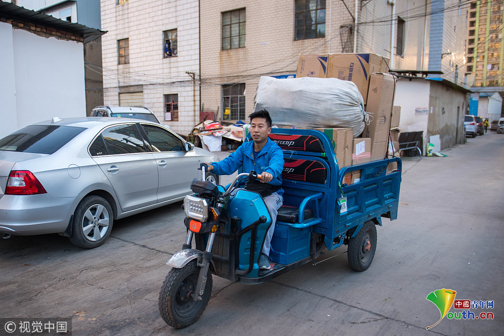 2018年10月16日,云南省昆明市,攝影師實(shí)拍90后快遞員熊忠桃的一天工作。作為一名快遞員,他25歲就買了房,9月份收入3萬多。圖片作者:銳圖