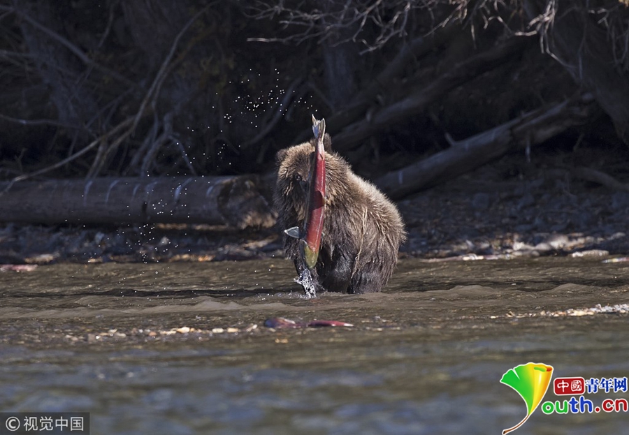 鮭魚看起來比小棕熊還“大”。