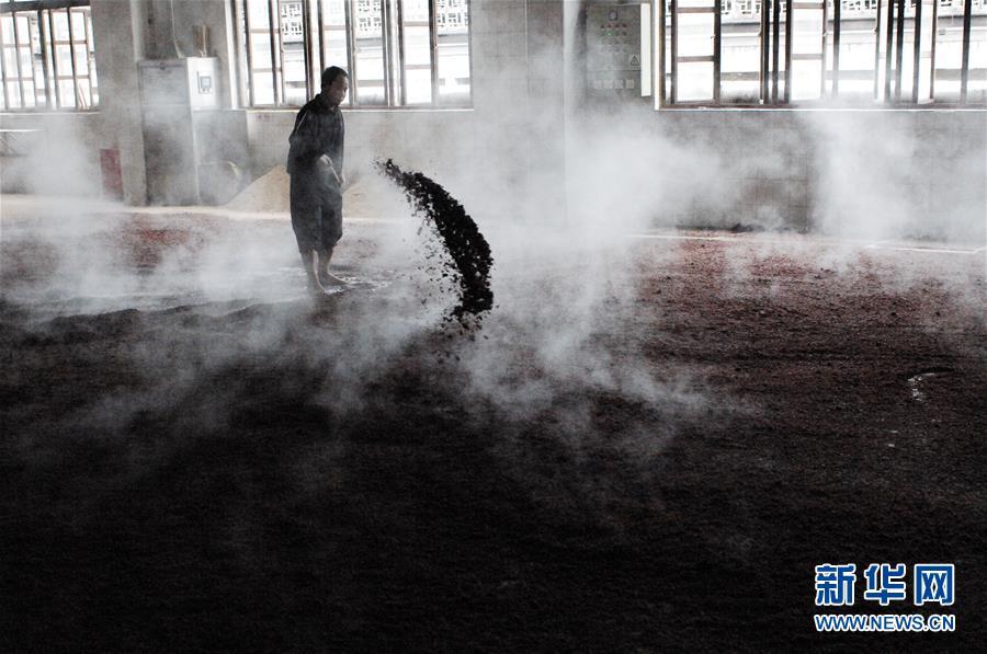 貴州省仁懷市茅臺鎮(zhèn)茅臺酒廠的釀酒工人把蒸好的糯高粱進行攤涼(10月23日攝)。 新華社記者 林立平 攝