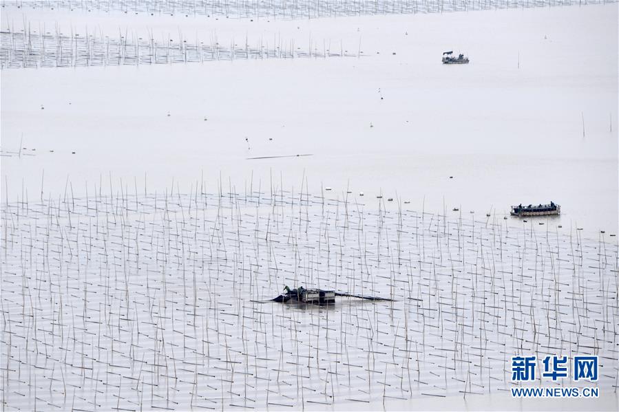 10月24日,福建莆田蔣山村村民在海上收割紫菜(無人機(jī)拍攝)?! ⌒氯A社記者姜克紅 攝