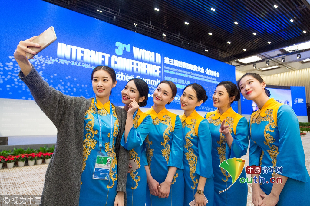 2016年11月16日,浙江烏鎮(zhèn),第三屆世界互聯(lián)網(wǎng)大會首日,身著群青鸞鳳刺繡旗袍的大學(xué)生禮儀賣萌自拍,成為會議間隙的一道風(fēng)景。