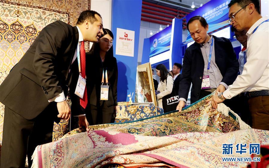 11月5日,一名來自伊朗的地毯展商(左)向參觀者介紹產(chǎn)品。 新華社記者 方喆 攝