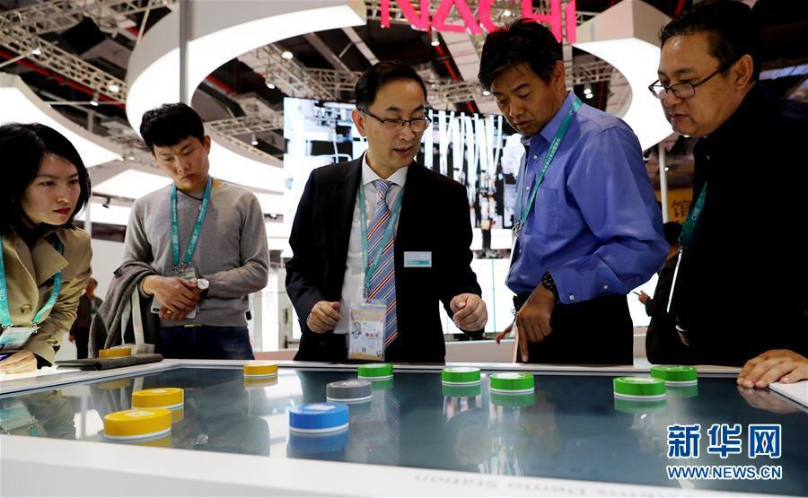 11月5日,一名工作人員在歐姆龍展臺演示與機(jī)器人進(jìn)行乒乓球?qū)?zhàn)。新華社記者 方喆 攝