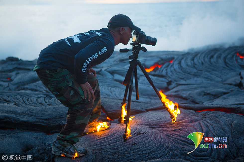 距離巖漿如此之近拍照十分危險(xiǎn)。攝影師Kawika Singson在拍攝過程中,經(jīng)歷了極大的危險(xiǎn)。流入海洋的巖漿量,風(fēng)向,以及巖漿基床的結(jié)實(shí)程度等風(fēng)險(xiǎn)都需要考慮。 圖片來源:視覺中國(guó)
