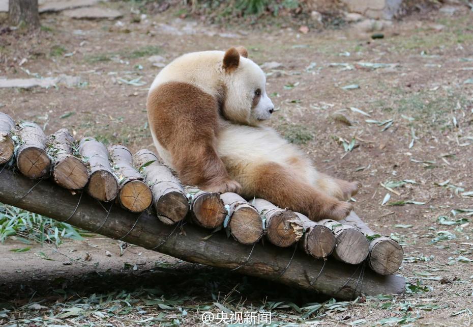 秦嶺大熊貓野化培訓(xùn)佛坪基地,7歲的棕色大熊貓七仔是目前全世界唯一能看到的棕色大熊貓活體。今年是它在基地過的第二個(gè)冬天,每逢下雪,七仔就興奮地滿園子跑,變身“雪花熊”。圖片來源:央視新聞官方微博