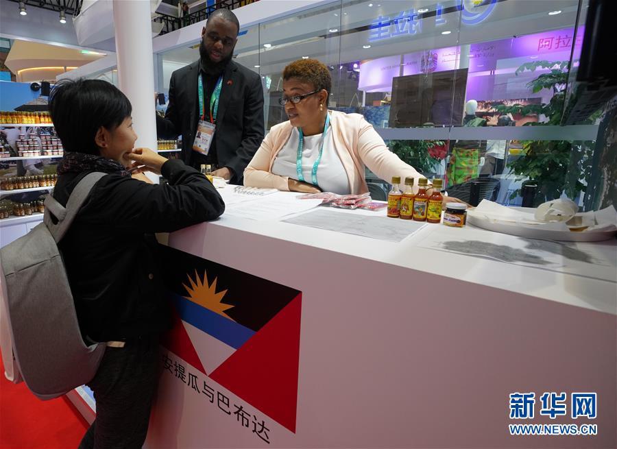 11月8日,在加勒比地區(qū)國家展區(qū)安提瓜和巴布達展臺,一名參觀者(左)與工作人員交談。 中國國際進口博覽會11月5日在上海開幕。國家貿(mào)易投資綜合展(國家展)是中國國際進口博覽會的重要內(nèi)容,共有82個國家、3個國際組織設(shè)立71個展臺。 新華社記者 程麗 攝