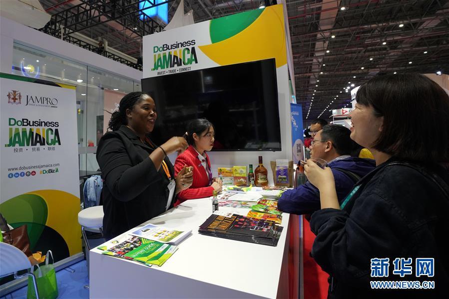11月8日,在加勒比地區(qū)國家展區(qū)牙買加展臺,工作人員請參觀者品嘗本國特色食品。 中國國際進口博覽會11月5日在上海開幕。國家貿(mào)易投資綜合展(國家展)是中國國際進口博覽會的重要內(nèi)容,共有82個國家、3個國際組織設(shè)立71個展臺。 新華社記者 程麗 攝