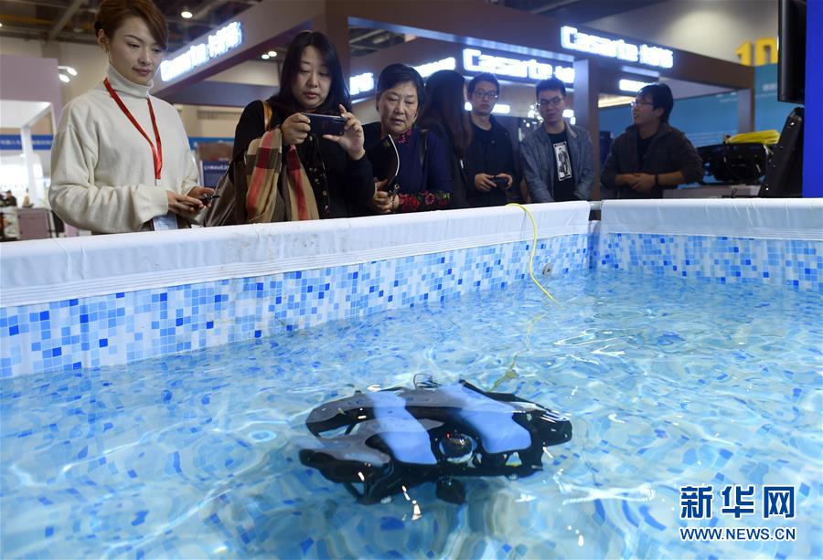 11月10日,人們?cè)谡箷?huì)現(xiàn)場(chǎng)觀看展出的一款小型水下機(jī)器人。 新華社記者韓傳號(hào)攝