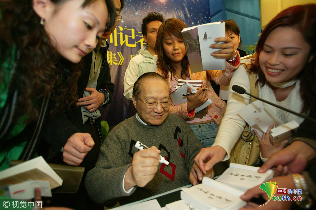 2005年12月17上午,中國南北文壇兩位大俠金庸和二月河在深圳五洲賓館和各地記者進(jìn)行了一場精彩對話。金庸迷找金庸簽名。圖片作者:北辰