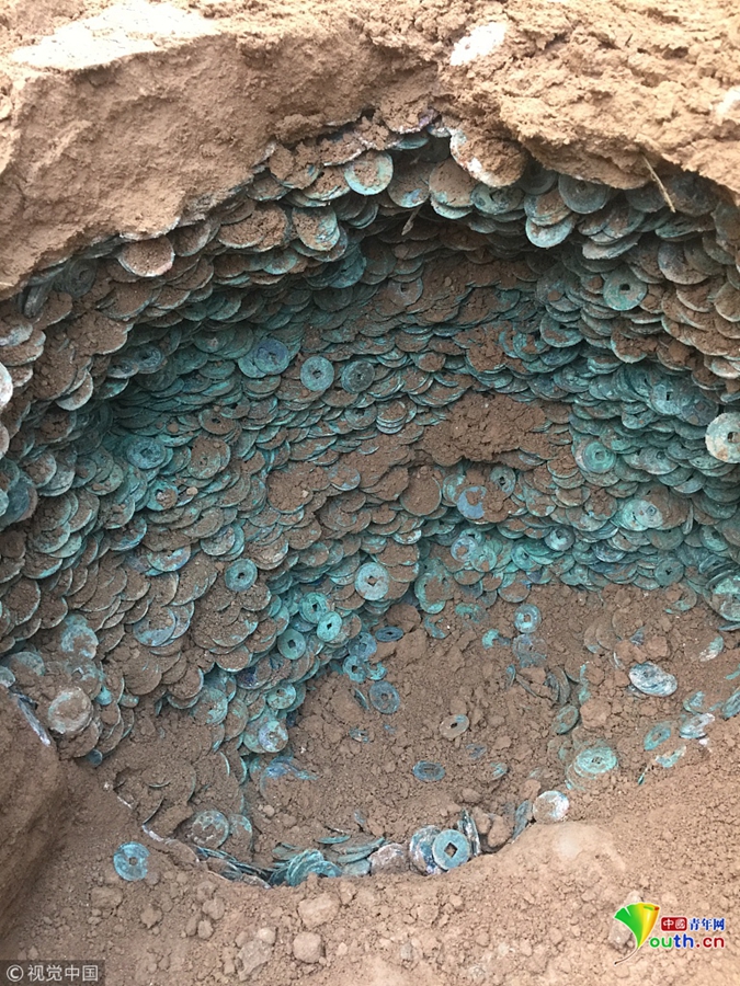 11月9 日中午11 時(shí)許,該縣縣城一工地在對(duì)地面開(kāi)挖施工時(shí),發(fā)現(xiàn)地下埋藏有大量古幣,立即報(bào)警。警方快速趕到現(xiàn)場(chǎng)進(jìn)行保護(hù)。得知這一信息后,市、縣兩級(jí)文物部門(mén)工作人員立即趕到,并由專業(yè)考古人員進(jìn)行發(fā)掘。發(fā)掘現(xiàn)場(chǎng)拍攝的照片顯示,這些古幣埋在一個(gè)圓形的土坑中。