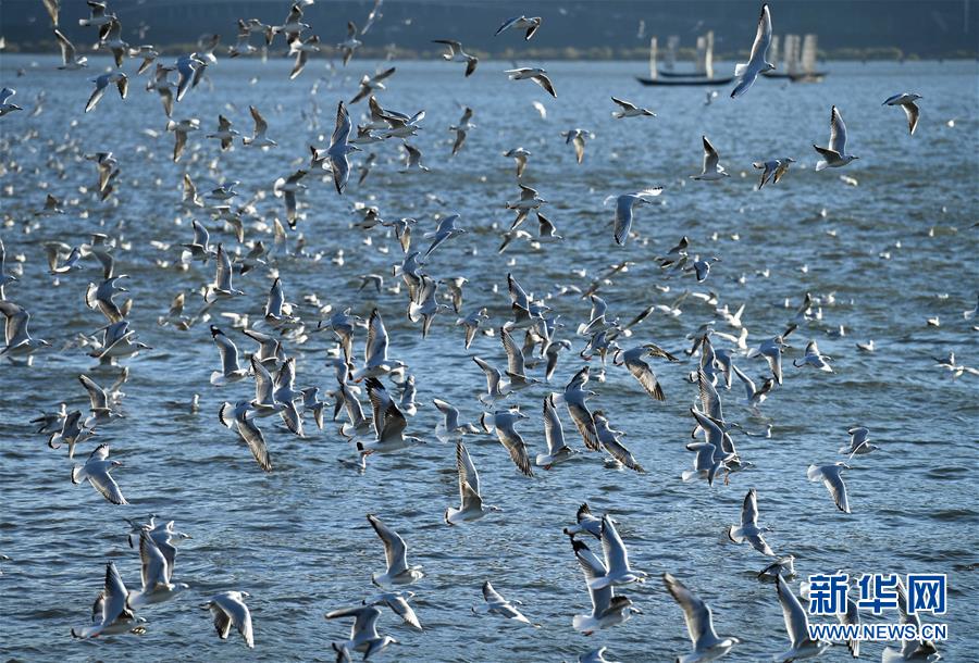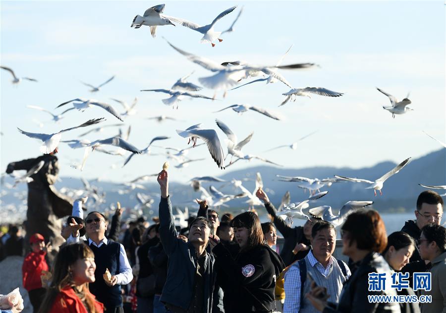 近日,云南省昆明市陽光明媚、氣候宜人,不少市民和游客來到滇池大壩、大觀公園等地,觀賞前來越冬的紅嘴鷗。