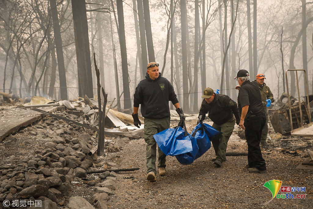 當(dāng)?shù)貢r(shí)間2018年11月10日至11月11日,美國(guó)加州Paradise,當(dāng)?shù)厣交鹚僚埃伟补賯冊(cè)跒?zāi)區(qū)搜尋遇難者遺體。圖片作者:Gabrielle Lurie