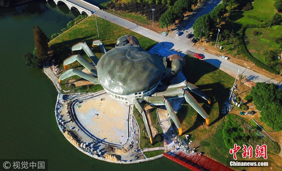 據(jù)了解,這是建造中的大閘蟹生態(tài)館,預(yù)計(jì)未來將在大閘蟹的白肚內(nèi)容納三層空間,集休閑、娛樂,以及有關(guān)大閘蟹體驗(yàn)于一體的設(shè)施。圖片來源:視覺中國