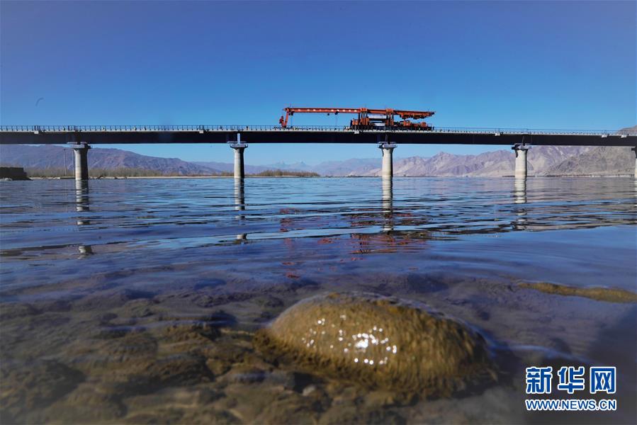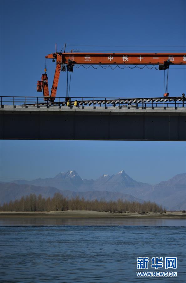 11月26日,施工人員在川藏鐵路拉林段貢嘎雅魯藏布江特大橋上鋪軌。 新華社記者 覺果 攝