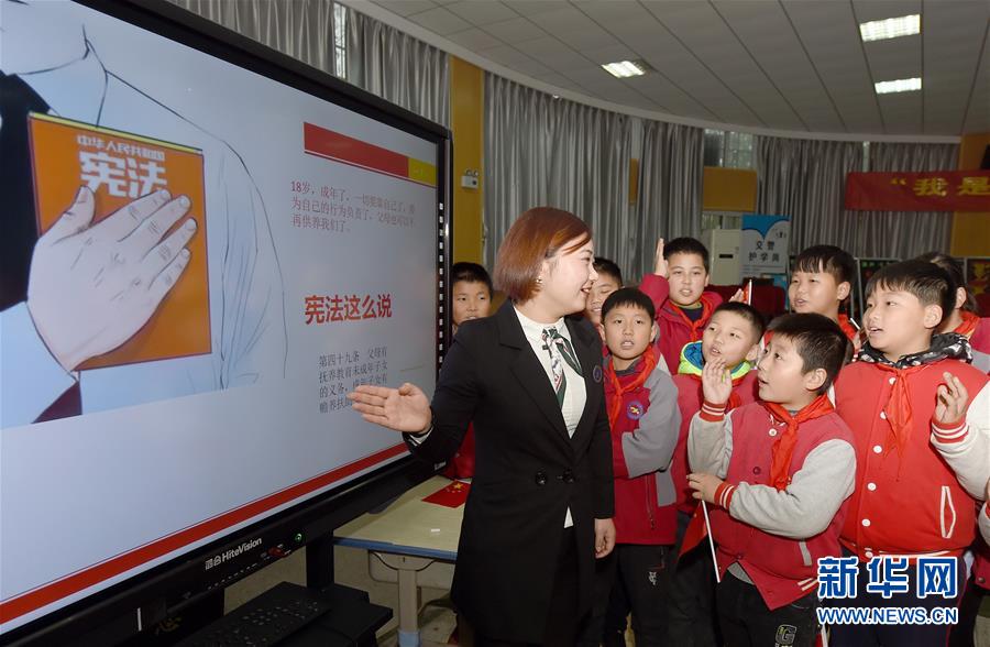 12月3日,合肥市經(jīng)開區(qū)明珠居委會(huì)法律援助律師在給明珠小學(xué)的學(xué)生們講解憲法知識(shí)。國(guó)家憲法日到來之際,各地學(xué)校紛紛舉辦主題宣講活動(dòng),對(duì)學(xué)生開展法治教育,幫助孩子們了解憲法知識(shí)。新華社記者 郭晨 攝