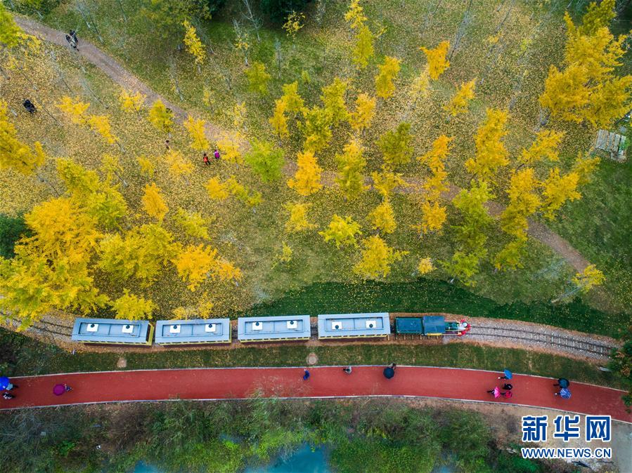 一列觀光小火車帶著游客穿行在銀杏林里(11月16日無人機(jī)拍攝)。近日,在浙江省長興縣小浦鎮(zhèn),“十里銀杏長廊”和近千畝花海經(jīng)過近一年的升級改造后,以嶄新的面貌與游客見面?;ê!⒂^光小火車、古村民宿、銀杏長廊等旅游項目全面提升了小浦鎮(zhèn)鄉(xiāng)村旅游的品質(zhì)。新華社記者 徐昱 攝
