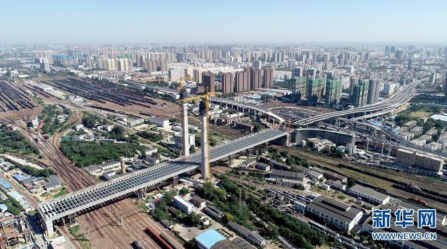 9月7日無人機拍攝的鄭北大橋鋼梁頂推施工現場。當日,跨越鄭州北站的鄭北大橋鋼梁頂推成功。鄭北大橋是東西走向的鄭州市農業(yè)路快速通道工程的一部分,需跨越鄭州北站。由于列車不能中斷運行,鄭北大橋不能采用常見的搭腳手架方式施工,而是采用頂推法,即在大橋一端把橋身拼接好,然后一段一段朝著鐵路編組站上方送過去,最終完成橋梁架設。新華社記者朱祥攝