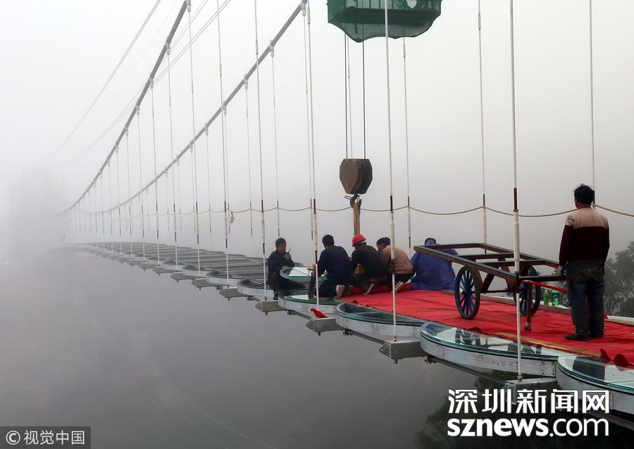2018年12月3日,在浙江玉環(huán)市上棧頭玻璃吊橋建設(shè)工地上,工人們正在北端橋頭鋪設(shè)橋面4厘米厚的玻璃。