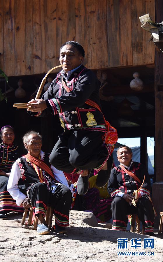 12月4日,在云南省瀾滄拉祜族自治縣酒井鄉(xiāng)勐根村老達保寨,拉祜族蘆笙舞傳承人李石開在表演蘆笙舞。 新華社記者張瑞琪攝