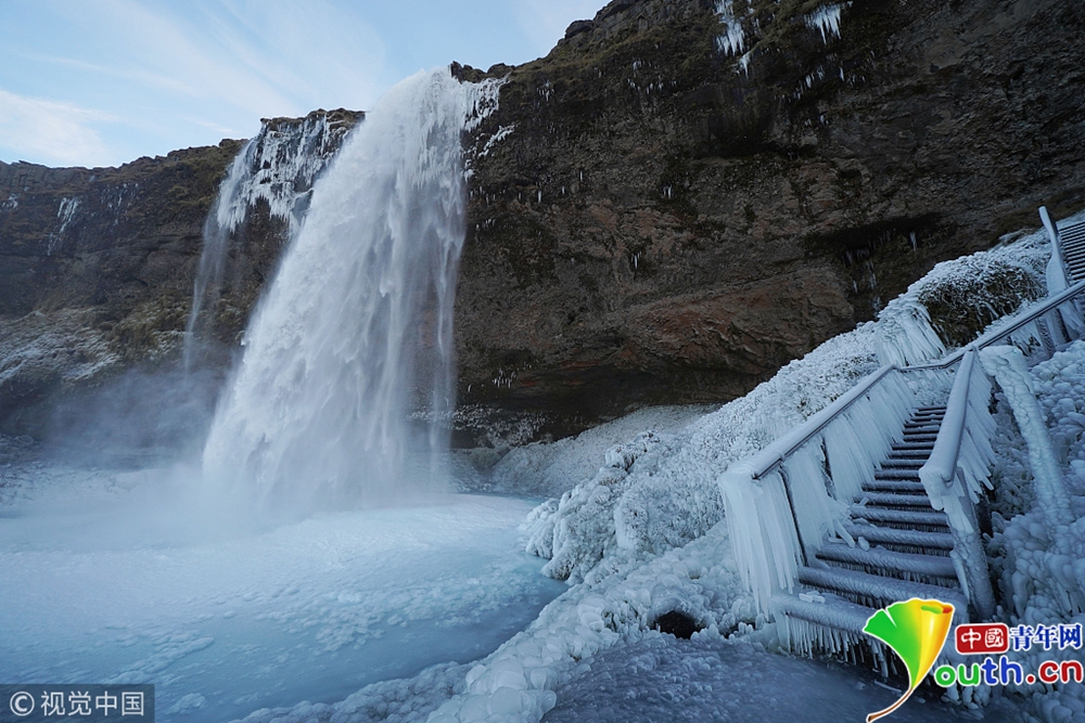 近日,冰島的塞里雅蘭瀑布在零下12攝氏度的氣溫下結冰,畫面彷如天外仙境。圖片來源:視覺中國
