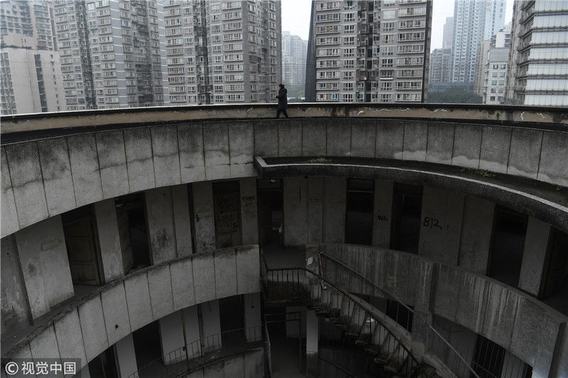2018年12月6日,重慶江北紅旗河溝汽車站內(nèi),有一棟獨特的八層圓環(huán)狀建筑,底層每天有不少進(jìn)出站的客車通行。據(jù)悉,這棟樓建于1990年,曾經(jīng)是車站旅館,如今一、二兩層用于車站辦公,其余樓層已廢棄。為確保安全,三層以上已經(jīng)被封鎖。圖為公交車穿過8層空心圓筒樓。徐勇/視覺中國