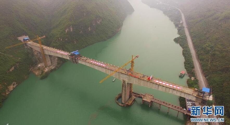 在重慶涪陵拍攝的渝懷鐵路涪秀二線重點工程——烏江右線大橋(10月23日無人機拍攝)。10月23日,由中鐵四局承建的渝懷鐵路涪秀二線重點工程——烏江右線大橋主跨成功合龍,標志著大橋主體工程全部順利結(jié)束。烏江右線大橋項目全程460.1米,主跨192米,跨越烏江和319國道。在兩年多的建設(shè)過程中,施工人員攻克了“不等高墩”“不對稱邊跨”“邊跨入隧”等多個技術(shù)難題。新華社記者王全超攝