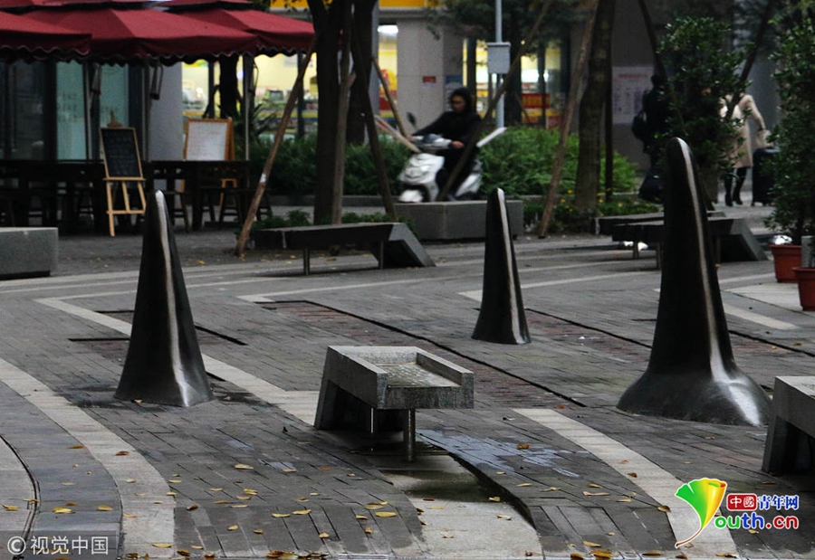 2018年11月20日,重慶一園區(qū)內(nèi)馬路中間突出一排“鯊魚鰭”,司機(jī)路人都被“嚇懵”了。突出的鯊魚鰭將兩側(cè)的車行道分開,原來,這是為了進(jìn)一步保證車流的有序進(jìn)出和行人過街安全,同時(shí)也為了防止亂停車占用人行道,設(shè)置了這種異形“隔離樁”。圖片來源:視覺中國(guó)
