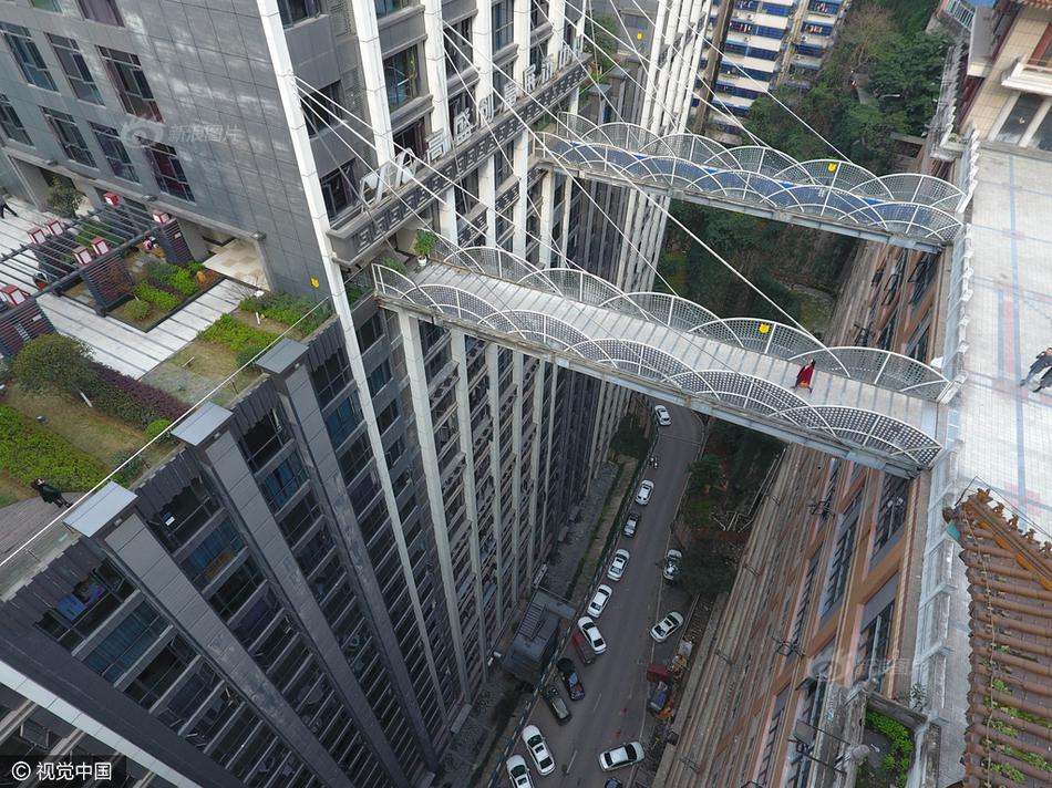 2017年3月16日,重慶,渝中區(qū)一棟大樓從22層架起兩座平行的天橋,連接對(duì)面的魁星樓廣場地面。圖片來源:視覺中國