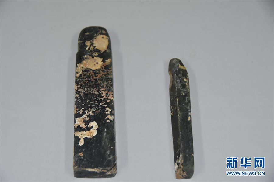 吳山祭祀坑內(nèi)出土的祭祀用的男女玉人(左為男,右為女,攝于12月7日)。 新華社記者都紅剛攝