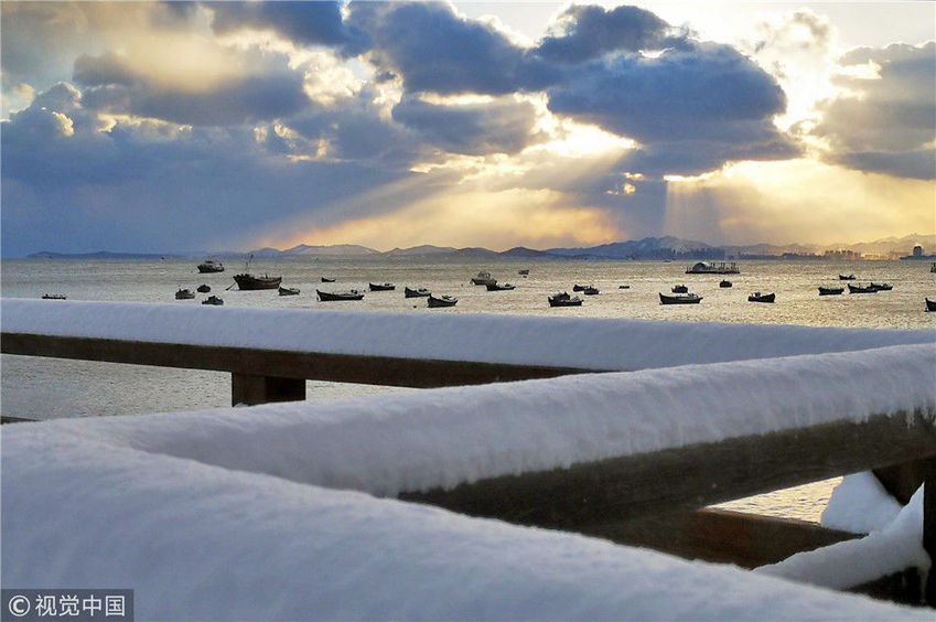 山東煙臺(tái)迎來(lái)初雪 獨(dú)特的海濱雪景美若童話