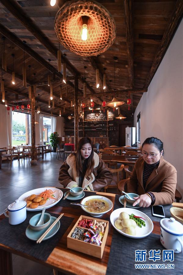 12月19日,章淑貞(左)在民宿“初憶小院”內(nèi)請一名客人品嘗自己做的點心。該民宿是河橋鎮(zhèn)“90后”女孩章淑貞開辦的,民宿融入了大量的現(xiàn)代建筑設(shè)計風(fēng)格,深受年輕人的喜愛。 新華社記者 徐昱 攝