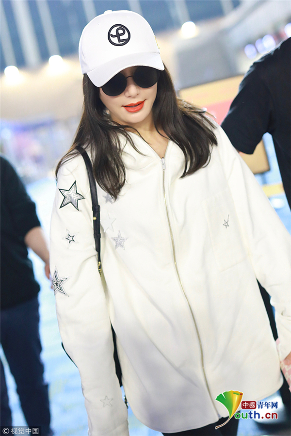 11月29日,上海,秦嵐現(xiàn)身機(jī)場(chǎng)。她戴白色鴨舌帽,穿白色星星圖案外套配微喇牛仔褲,架黑超涂紅唇笑靨如花。