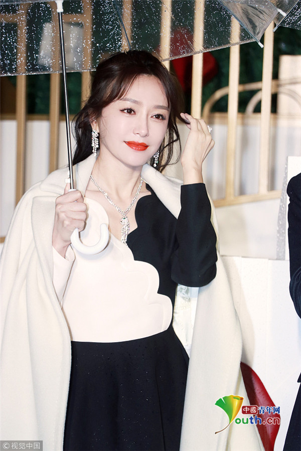 秦嵐撐傘雪膚紅唇美如畫(huà) 優(yōu)雅品香檳氣質(zhì)高貴迷人