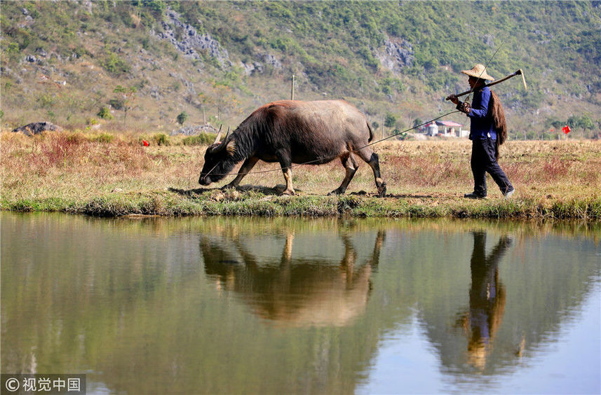 12月17日,在廣西桂林的臨桂區(qū)田心村這座叫做狀元橋的小橋上,剛吃過午飯,老許和他的水牛搭檔又要開始一場生態(tài)演出了。