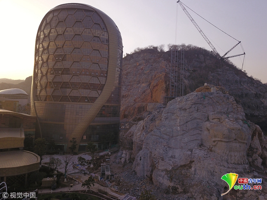 2018年12月23日,南京浦口區(qū)老山風(fēng)景區(qū)三河采石場(chǎng)宕口,利用宕口廢棄工地進(jìn)行生態(tài)修復(fù)的蜂巢酒店主體完工。經(jīng)過(guò)100名雕刻工人近半年的施工,酒店兩側(cè)被破壞的山體變成兩只高30多米的巨型山體雕塑石獅,栩栩如生,場(chǎng)面極其震撼。