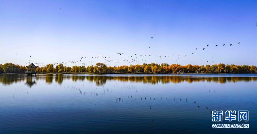 在位于新疆巴音郭楞蒙古自治州輪臺(tái)縣的一處胡楊林,一群鳥從水面上飛過(10月25日攝)。 在即將過去的2018年,各地?cái)z影師用鏡頭記錄下四季中國。大江南北,一幅幅色彩斑斕的美麗畫卷徐徐展開。 新華社記者 趙戈 攝