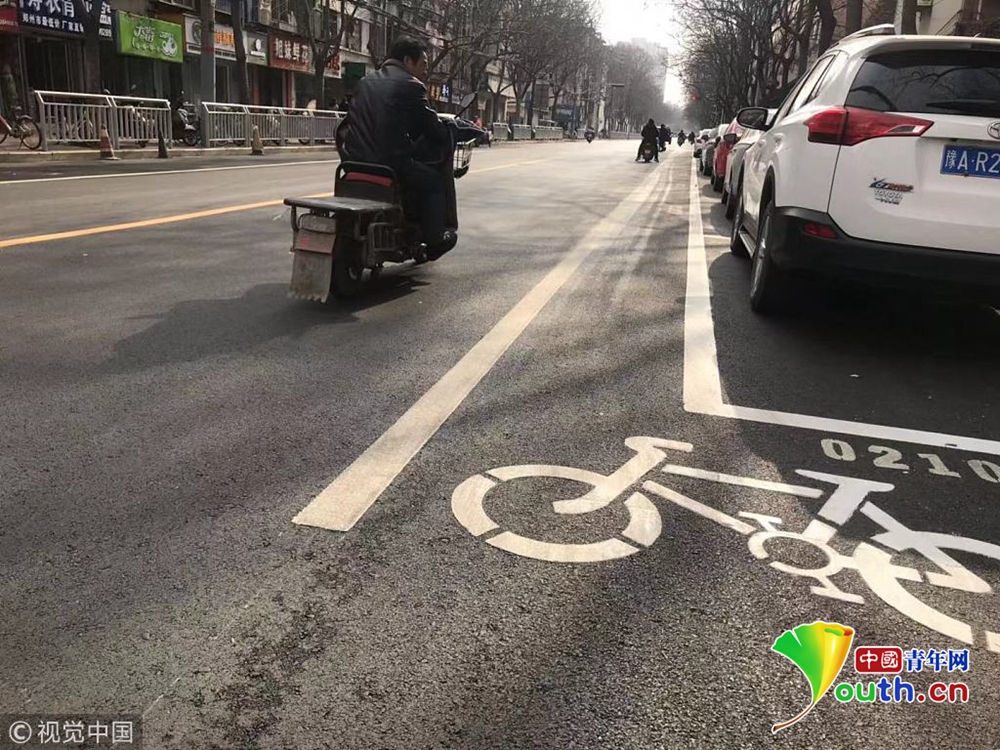 12月25日報道,12月24日,鄭州市文化宮路有市民反映,新鋪好的文化宮路非機動車道被剛劃的“停車位”擠得只有0.8米寬。原本2米多寬的非機動車突然有汽車停放后,騎車經過的行人只得被逼進快車道通行,很不安全。